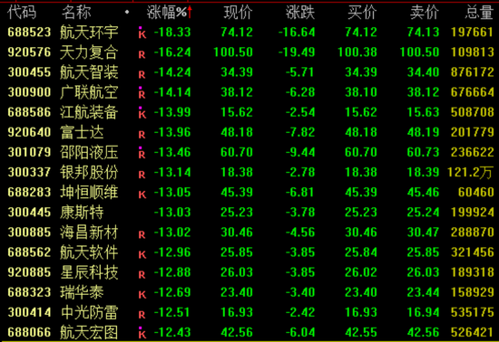 商业航天概念盘中大幅下挫,截至收盘,航天环宇跌超18%,邵阳液压跌超13%,铂力特(维权)、信维通信等跌超10%,中国卫通、航天发展、江顺科技等跌停。