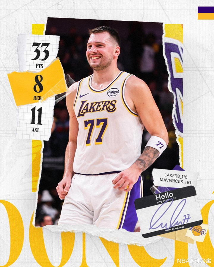 湖人队超级巨星卢卡东契奇,在此役强势爆发。东契奇登场39分钟,15投8中,三分8中3、罚球15中14,怒轰33分8篮板11助攻1抢断1盖帽的大号两双数据,有5失误瑕不掩瑜,正负值+18高居全场第二。东契奇以53%的命中率轰下了全场的最高分,在进攻端彻底打疯了。