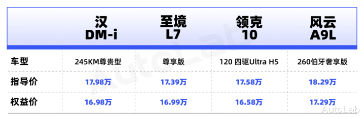 参考销量榜,我们选取了四款主流中大型混动轿车,分别是比亚迪汉DM-i、别克至境L7、领克10 EM-P以及奇瑞风云A9L。