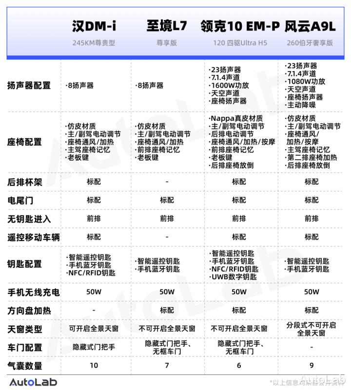 细节配置方面,领克10 EM-P是唯一支持 UWB 数字钥匙的车型,风云A9L则多了主动降噪;至境L7在后排杯架、遥控移动车辆这些小配置上反而缺席了一些,存在感相对最低。