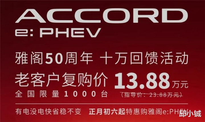另外,海报中所写的“雅阁50周年 十万回馈活动”,50周年的是燃油雅阁,而不是插混雅阁。从销量表现来看,燃油版雅阁最近半年月销量都在万台以上,年底冲销量时月销量接近2万台,这在同级别的合资B级车中还是不错的。而插混雅阁,去年全年销量超4千台,平均每个月销量就是三位数。很显然,雅阁50年的口碑,是油车打下来的基础,而不是这台e:PHEV插混版。
