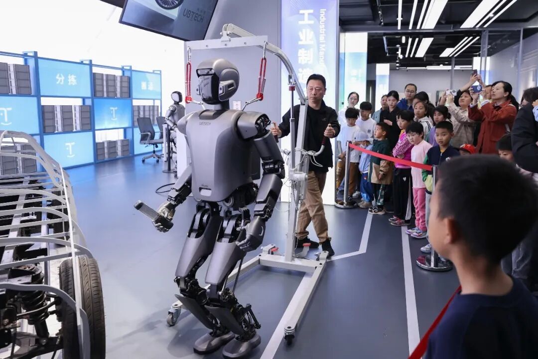 在北京机器人产业园(亦庄)的北京“机器人大世界”,参观者在观看工业机器人检测无人驾驶汽车轮胎的场景演示。陈晓根摄(影像中国)
